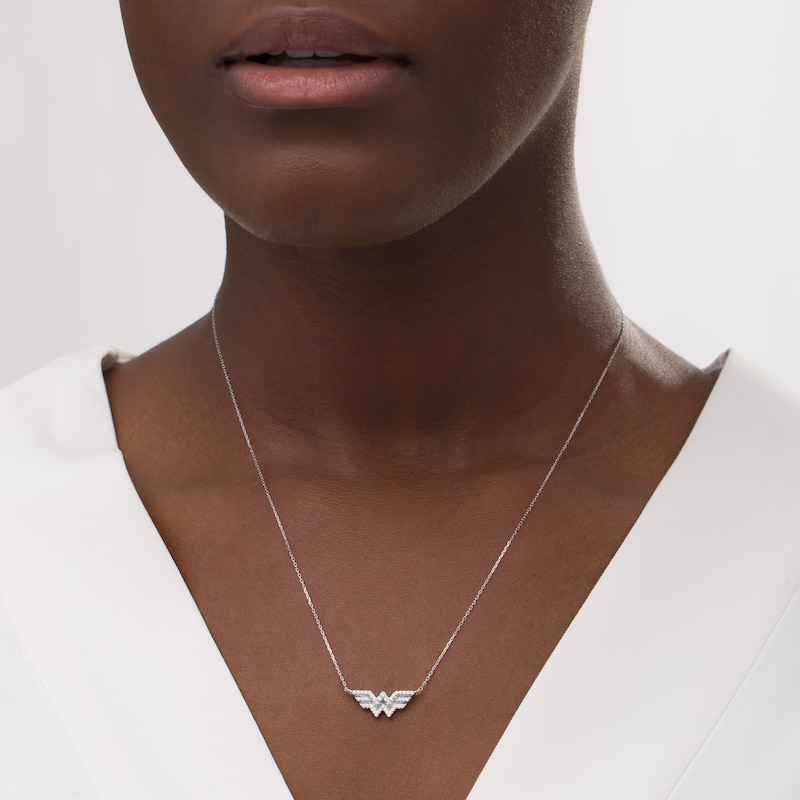 Created in sterling silver, this choice showcases the "WW" logo encrusted with sparkling diamonds. Captivating with 1/6 ct. t.w. of diamonds and a bright polished shine, this 1.0-inch symbol suspends centred along a 17.0-inch cable chain, with an additional closure ring at 16.0 inches, that secures with a spring-ring clasp.This exclusive fine jewelry collection inspires you to wear your strength, confidence and power.