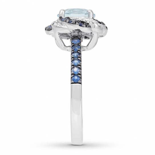 A mesmerizing display of color makes this engagement ring a truly stunning symbol of love. Ribbons of blue sapphires and shimmering round diamonds swirl outward from the aquamarine center, while more blue sapphires decorate the band. The 14K white gold ring has a total diamond weight of 1/15 carat.