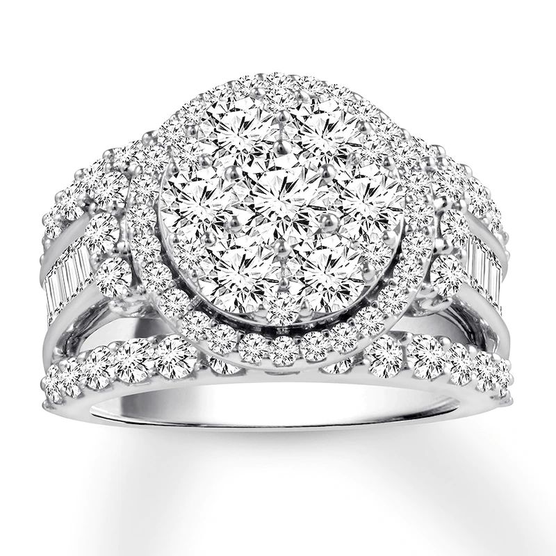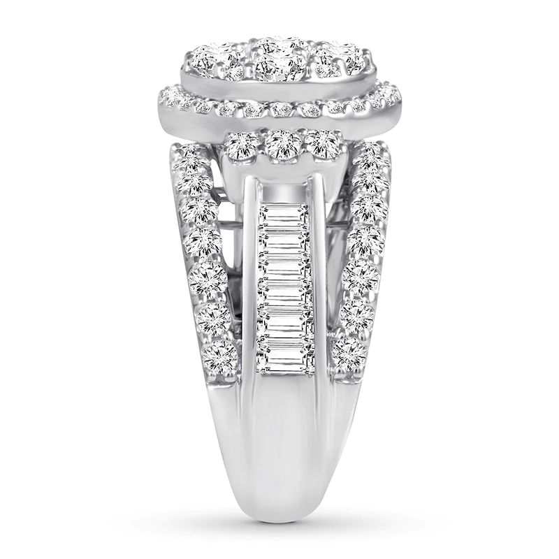 Imagine her surprise when she sees this unforgettable engagement ring. With a center arrayed in dazzling round diamonds, the ring is sure to capture attention. The band showcases a sparkling row of round diamonds at the top and bottom with a line of baguette diamonds in the center to complement. Styled in beautiful and versatile 14K white gold, the ring has a total diamond weight of 3 1/2 carats. Available online while supplies last. Previously Owned Treasures are not eligible for in-store pickup. Previously Owned Treasures may only be shipped either to your home address or to an alternate address.